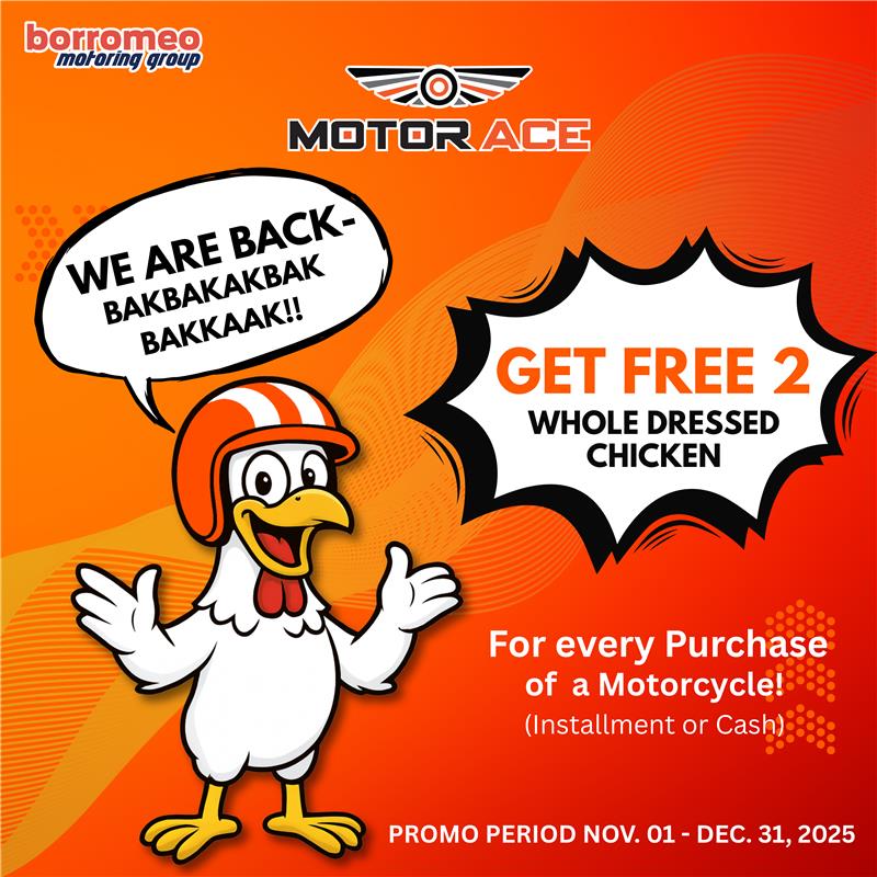 We are thrilled to announce that the most anticipated promo is back! Motor Ace Philippines Inc., by Borromeo Motoring Group, is giving away two (2) Whole Dressed Chickens FREE with every motorcycle purchase. This fantastic offer applies to all multi-brand units, whether you choose a Honda, Yamaha, Suzuki, TVS or Kawasaki. Regardless of your payment method—cash or installment—you are fully entitled to receive these two complimentary Whole Dressed Chickens. However, this is a limited-time opportunity! You must rush to purchase your motorcycle within the next two months (November to December). This promotion officially runs only within this period, from November 1, 2025, until December 31, 2025, before the new year arrives.